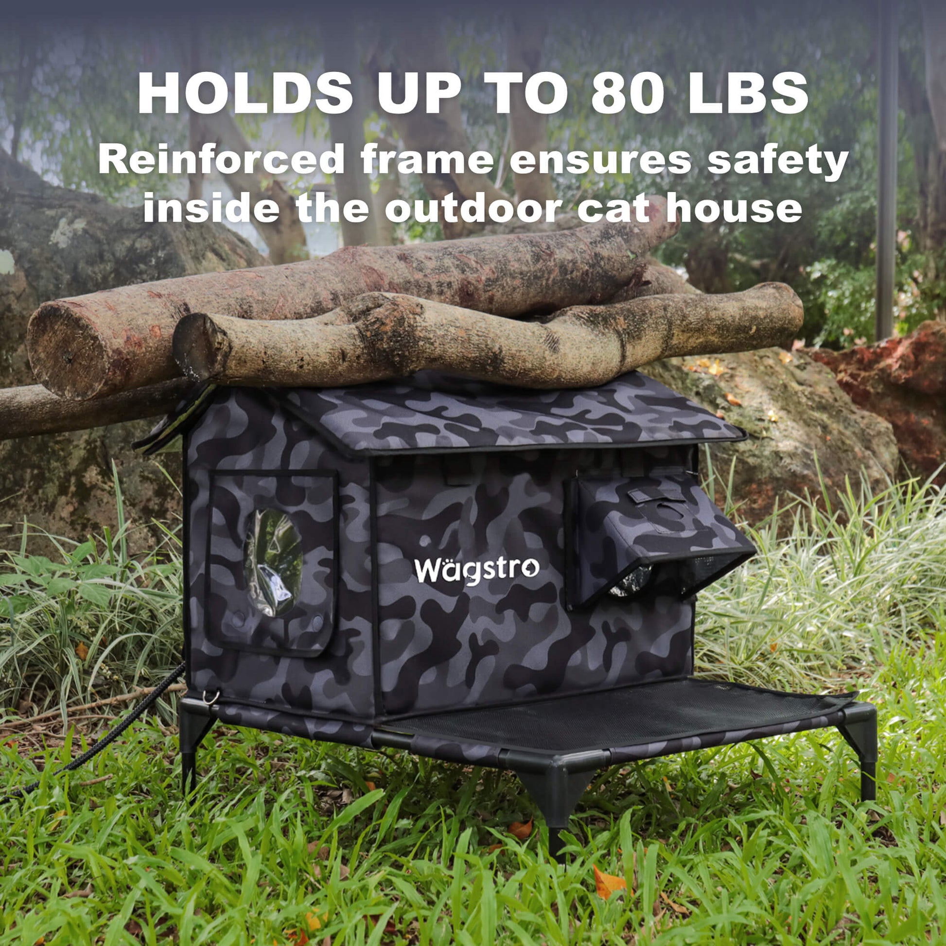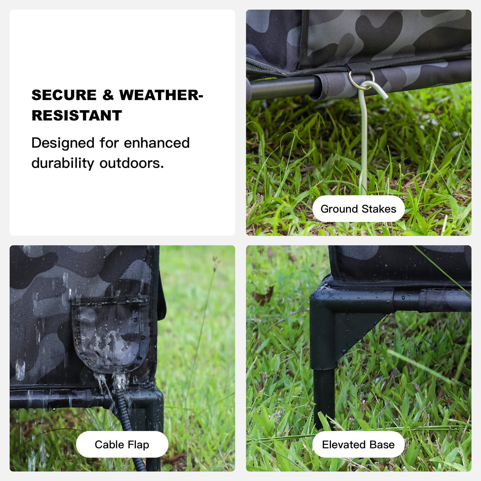 The double overhang roof sheds rain and snow fast and keeps the doorway dry, creating a porch-like cover cats trust. A compact footprint fits porches and tight spaces, while a PVC-coated waterproof shell with insulated walls locks in warmth. The 5″ elevated, staked base stays dry on wet or frozen ground; dual doors (front entry + rear escape) add safety. A reinforced fiberglass frame holds steady, and a sealed cable flap powers the included low-voltage heating pad . Camera pockets inside and out; easy-clean surface.